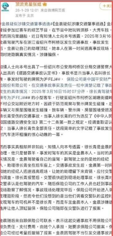 张雨绮事件余波未平,金晨卷入的交通肇事“代驾顶替”风云再度燃烧公众情谊。