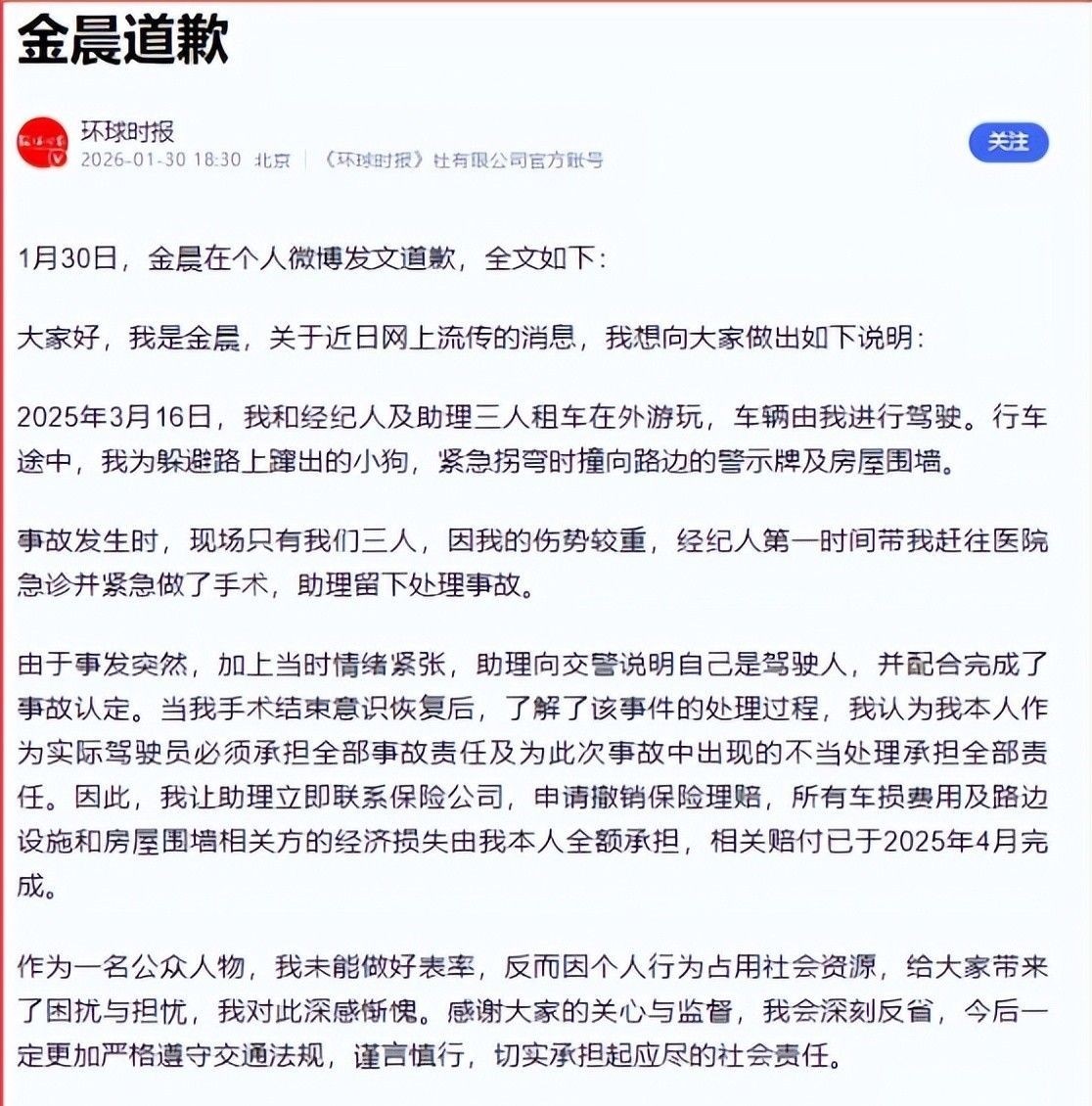 1月30日,浙江绍兴市柯桥区公老实局发布巨擘通报,规复事件始末;金晨同日发布长文致歉,并配发面部伤情实拍图,这场抓续十余日的全球信任危险终见分晓。