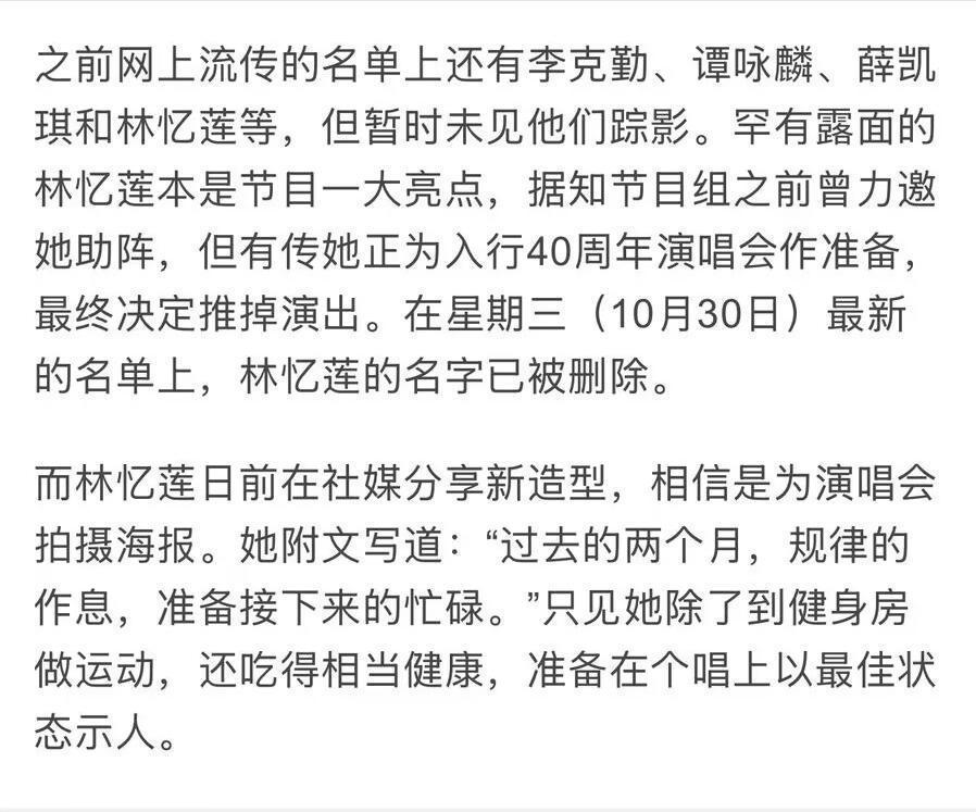 莫得来的原因也有官方报说念了之前节目组一直在邀请林忆莲但有传林忆莲正在为入行40周年的演唱会作准备是以推掉了声生束缚的邀约。