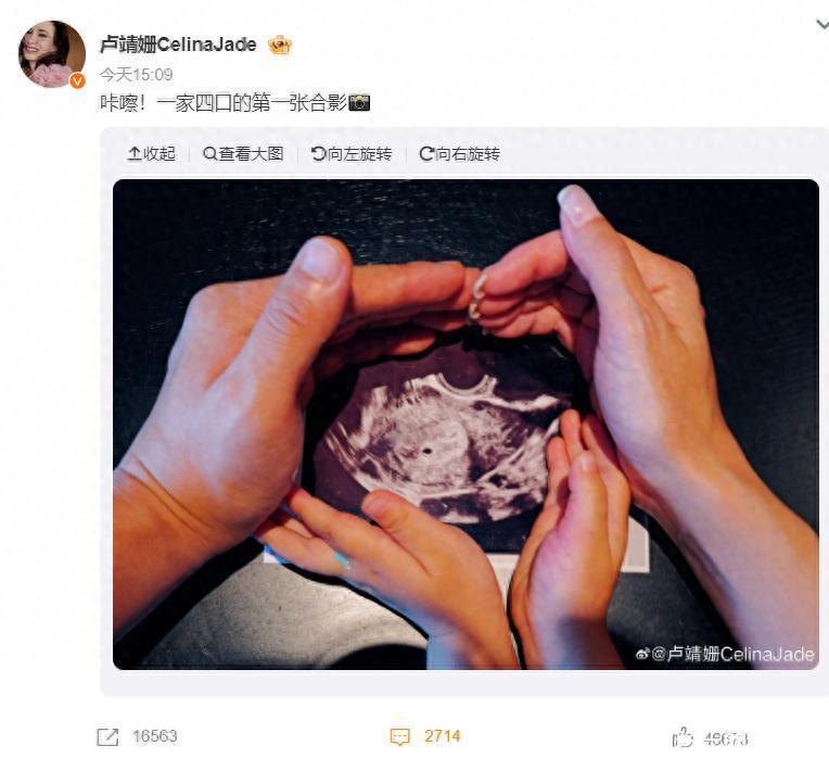 5月4日下昼3点多,卢靖姗发文“咔嚓!一家四口的第一张合影”。配图是卢靖姗、韩庚和他们的犬子用手围着B超的相片。