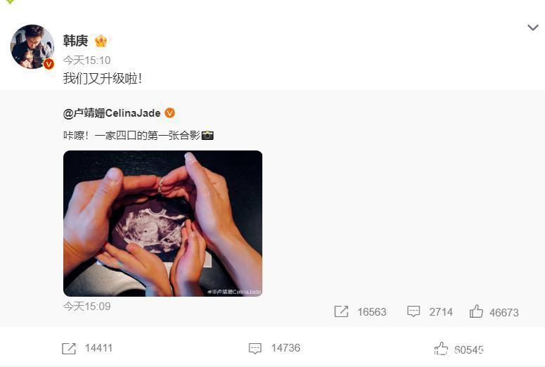 马上韩庚转发了卢靖姗的这条动态,并配文:咱们升级啦。