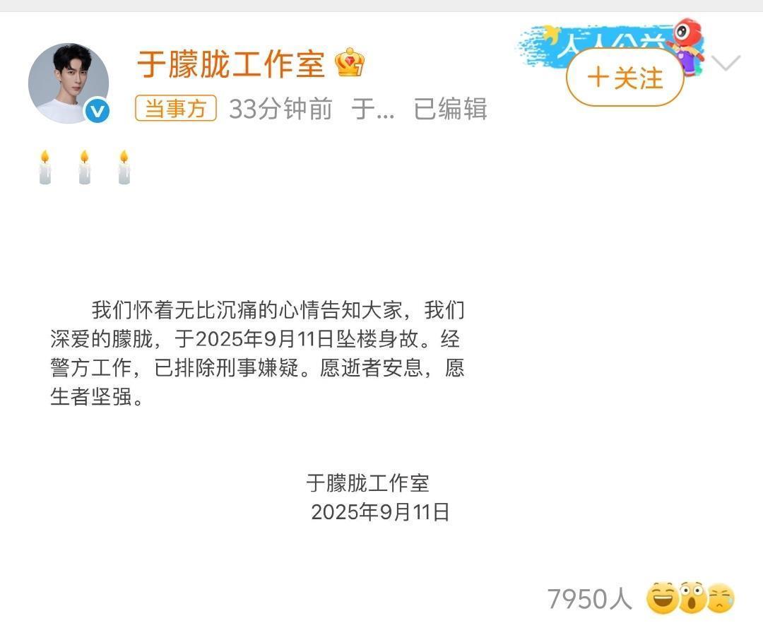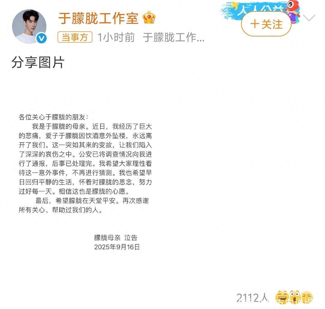 16日晚,于朦胧母亲通过责任室发文,文中称:近日,我履历了浩荡的悲哀,爱子于朦胧因饮酒不测坠楼,恒久离开了咱们。这一出乎预感的变故,让咱们堕入了深深的哀伤之中。