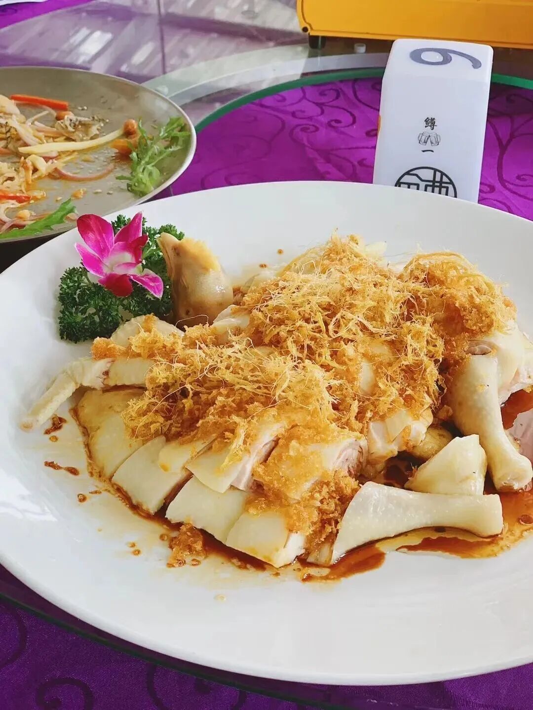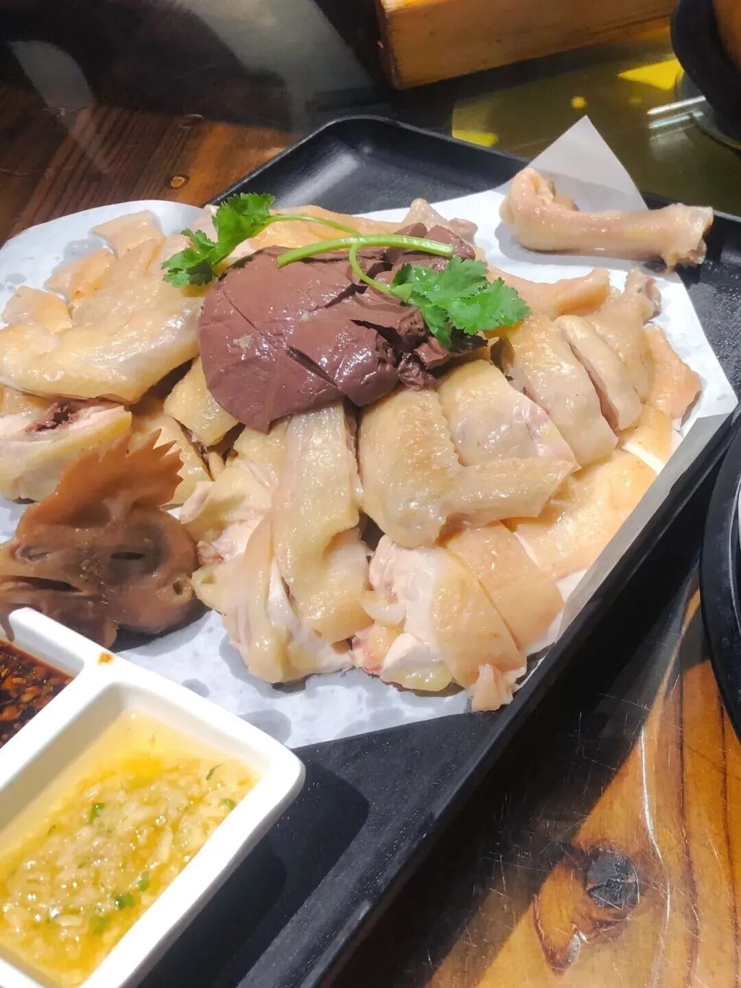 经过“冰火两重天”之后的鸡皮和鸡肉十分细嫩,流露口感配上姜葱汁特有的滋味,下饭一绝!